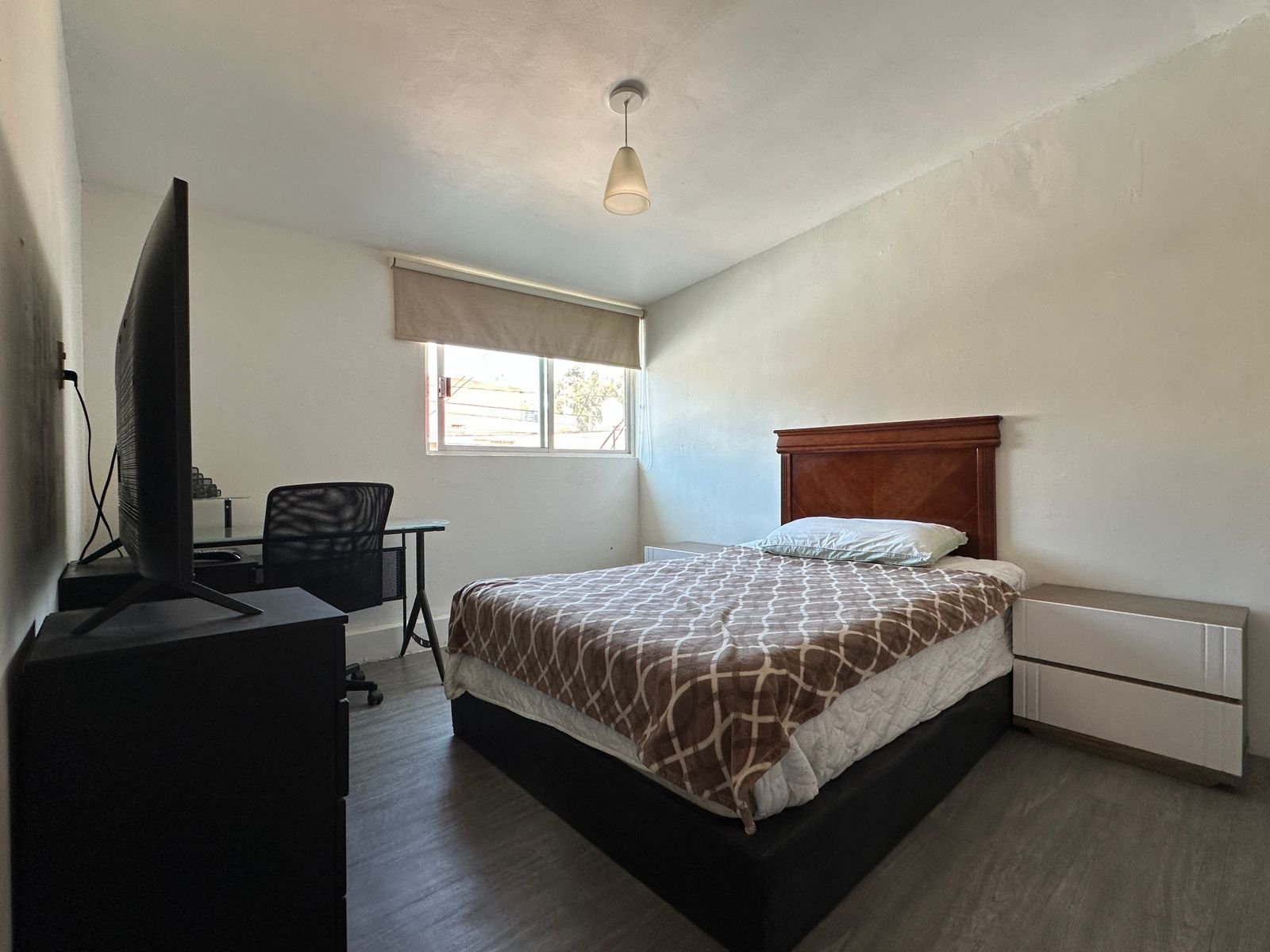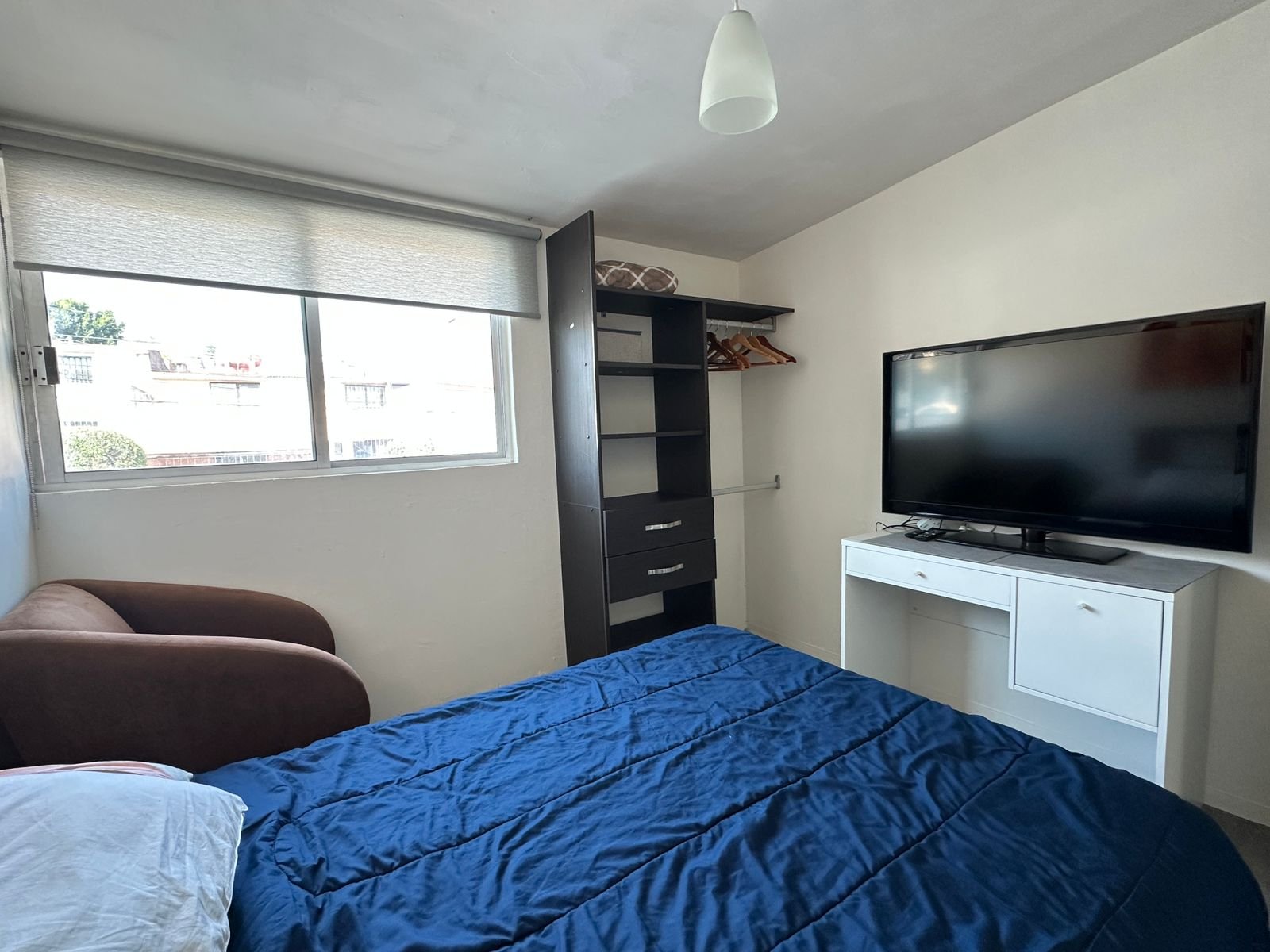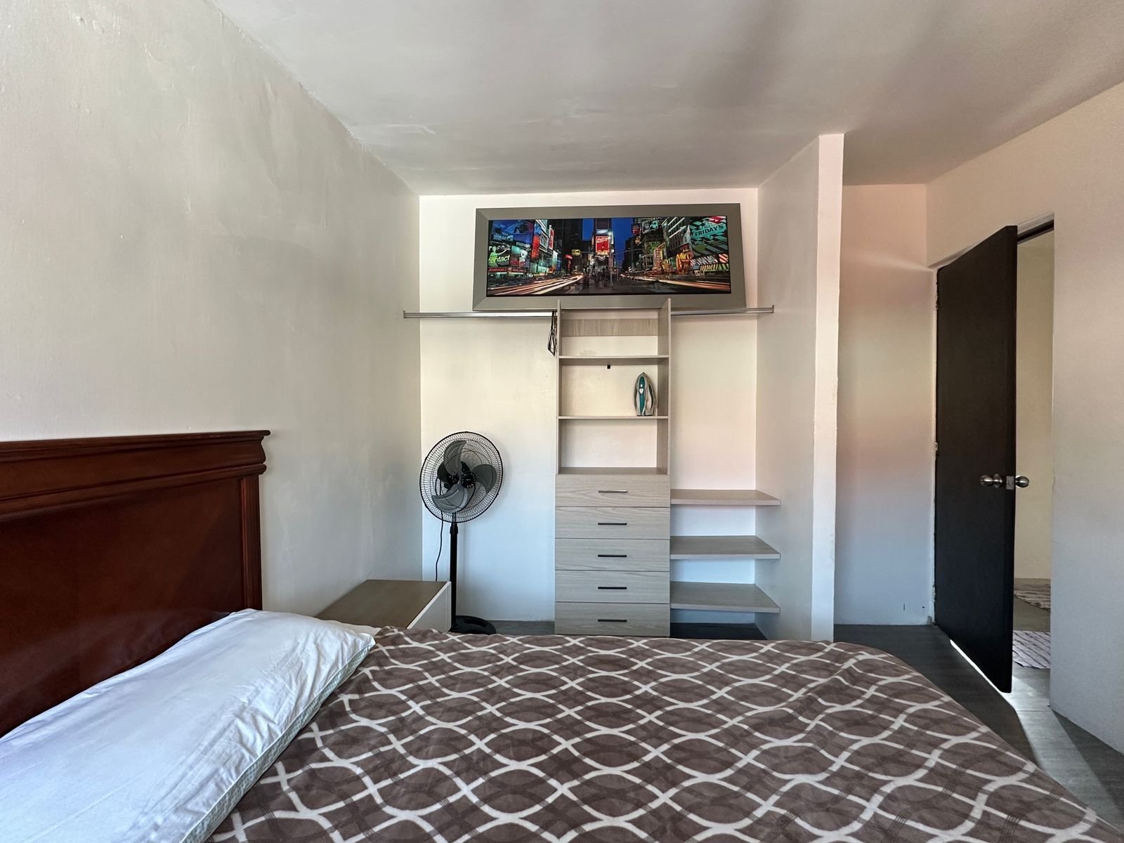 1 recámara con cama, closet, TV y baño completo