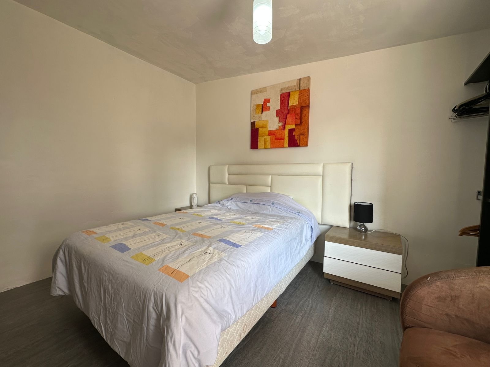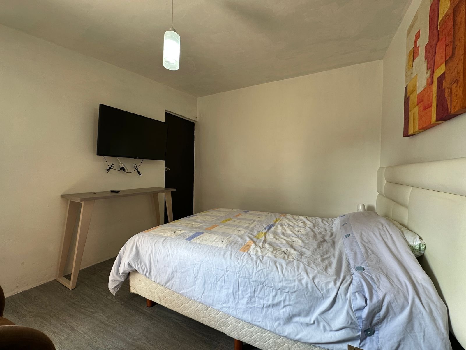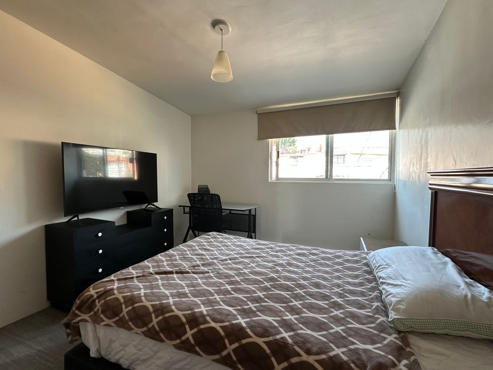 1 recámara con cama, closet, TV y baño completo